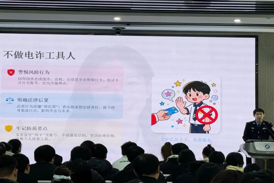 宣讲结束后,牡丹江市公安局反诈中心民警单宏亮结合高校毕业生求职就业场景,围绕求职诈骗、虚假招聘、信息泄露等常见骗局类型进行深入剖析,用真实案例提醒同学们务必通过正规渠道获取招聘与志愿服务信息,提高识骗防骗意识,切实保护个人信息与财产安全,为奔赴基层、服务西部筑牢安全防线。
