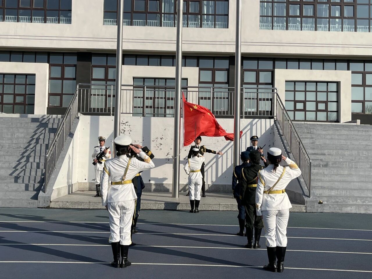 升旗仪式开始,国旗护卫队迈着整齐划一、铿锵有力的步伐,将国旗护送至升旗台。升旗手将国旗抛向空中,现场气氛庄严肃穆,观礼人员肃立如松,全体同学行注目礼。