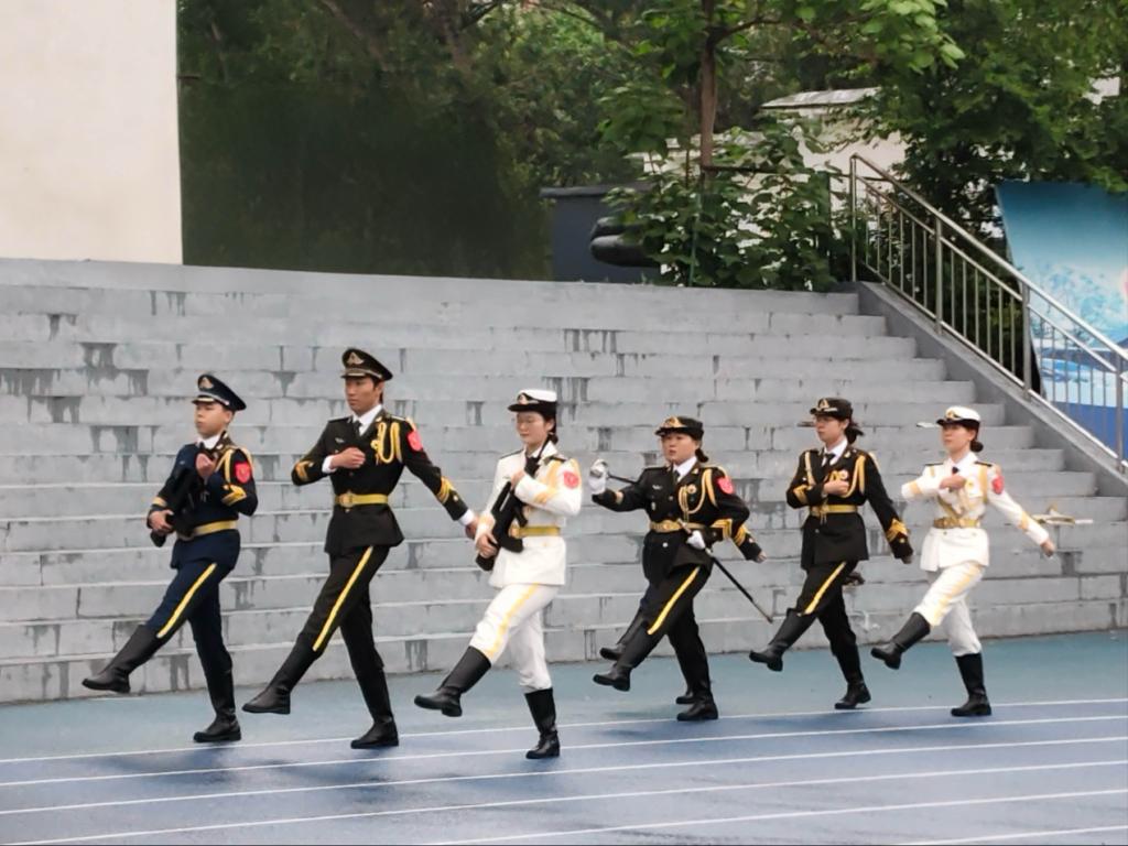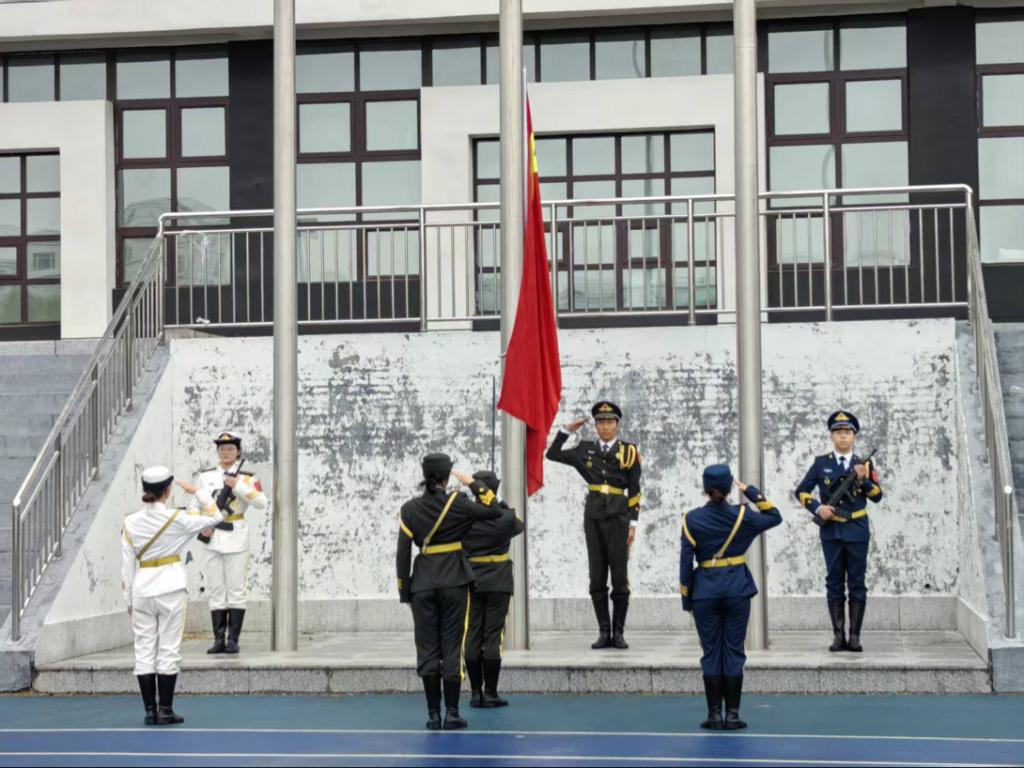 激昂的国歌响起,国旗护卫队以铿锵正步护卫五星红旗庄严走向升旗台,擎旗手振臂扬旗,五星红旗迎着朝晖冉冉升起,全体师生肃立注目,以崇高礼仪展现赤子丹心。