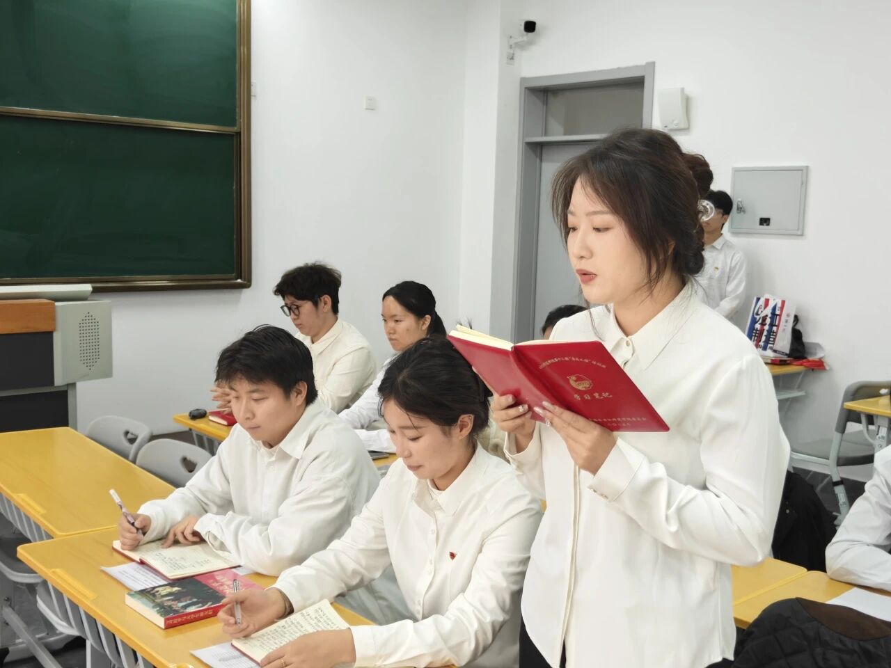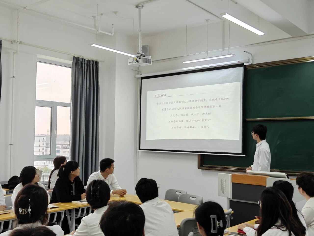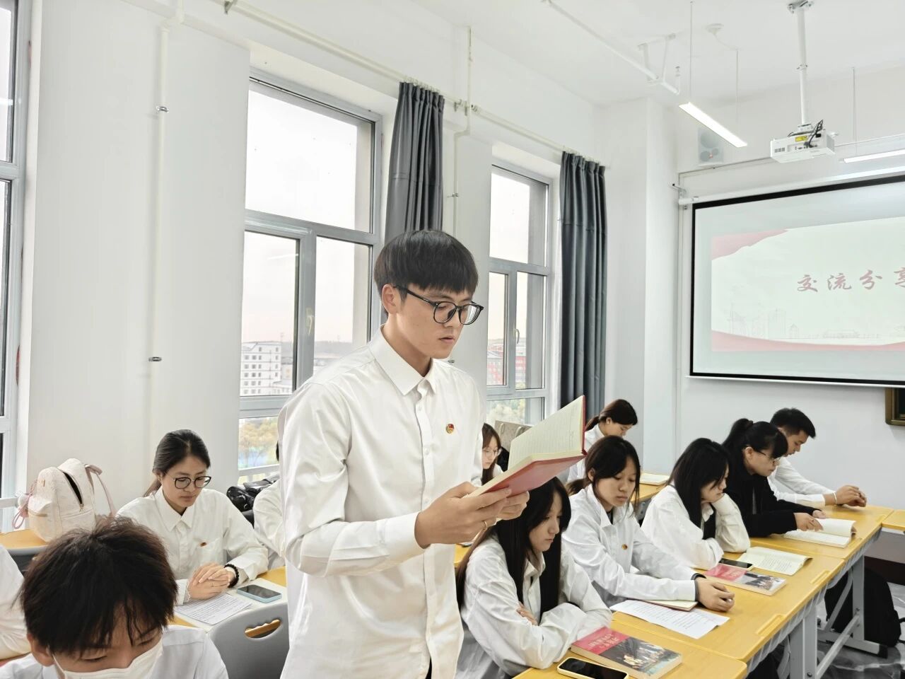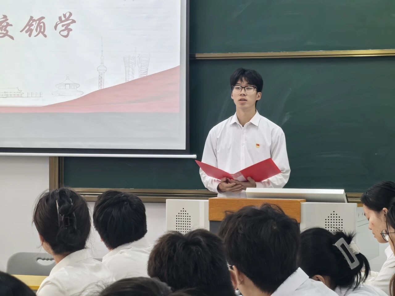 接下来,由青马工程培训班班长刘洪志领学,他从《习近平与大学生朋友们》一书的成书背景、时代价值和对青年影响三部分讲述,并结合自身经历深入解读了这部“有温度、有情感”的著作。他与学员们分享,书中那句习近平总书记叮嘱我们“不做夸夸其谈、眼高手低的'客里空’”的谆谆教诲,让他的暑期三下乡之旅变得不空虚,有价值,是一场真正意义上的“实干”之旅。