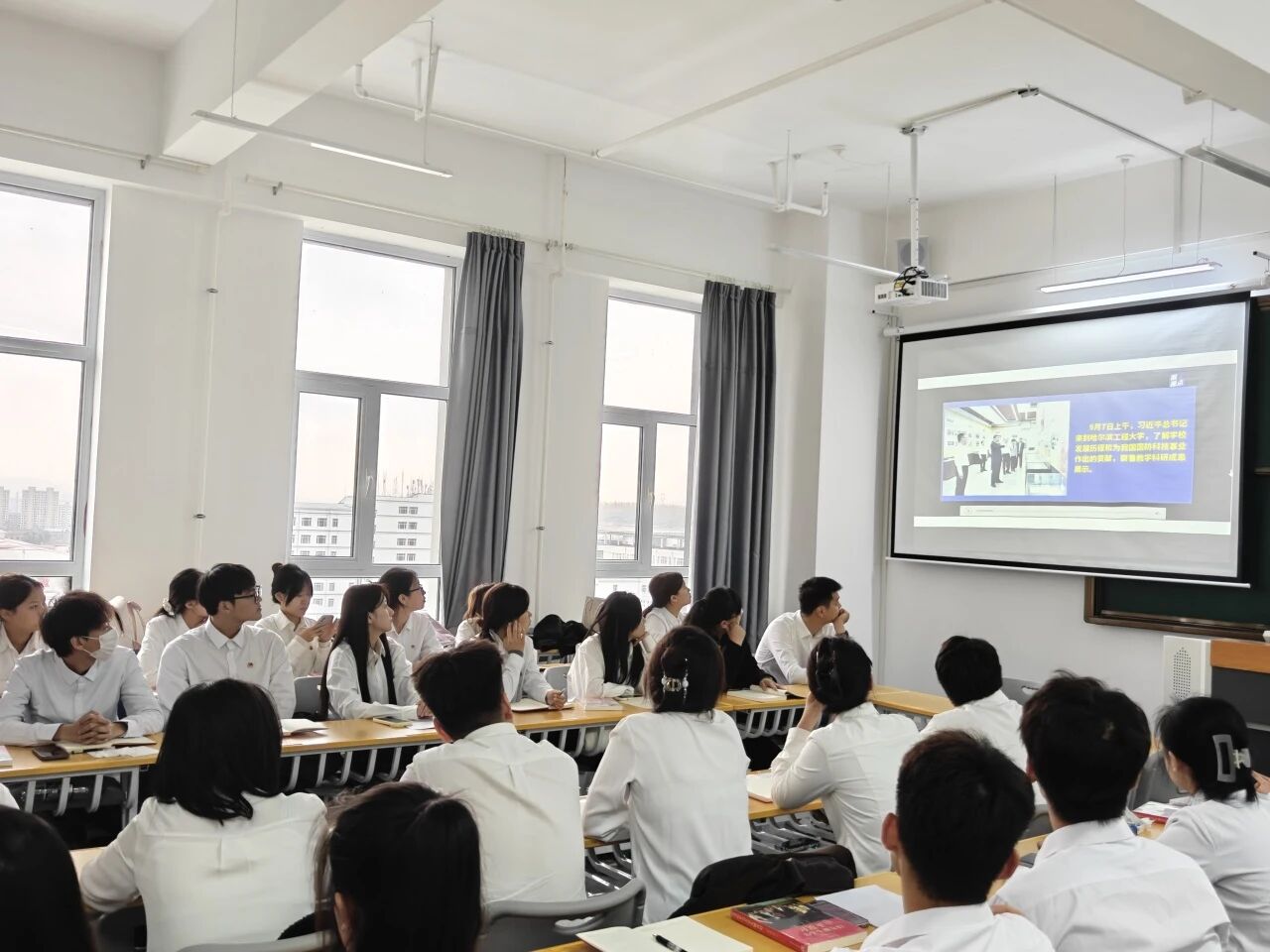 在分享过后,学员们共同观看了习近平总书记走访哈尔滨工程大学的采访视频。每一个场景都生动地展现了总书记对高等教育的重视,对青年学子的关怀与期望。