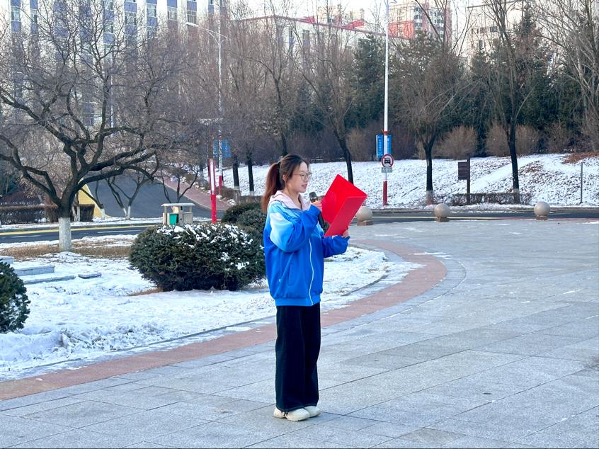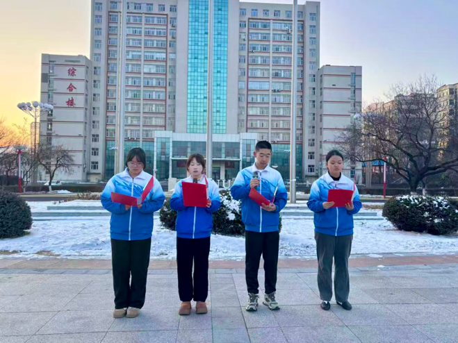 青春向党,声颂家国。随后,李想、左佳玉、张思哲、王姝心同学带来了集体朗诵《致一二·九的青春》。他们声音洪亮、情感饱满,回溯着“一二·九”运动中热血青年的呐喊与抗争,诉说着新时代青年对先辈的追思与传承,用文字复刻峥嵘岁月,用声音传递使命担当,将对革命先烈的缅怀、对祖国母亲的热爱、对青春理想的坚守娓娓道来,字字句句掷地有声,回荡在田径场的每个角落,让红色精神在朗诵中赓续,让爱国情怀在心中扎根。