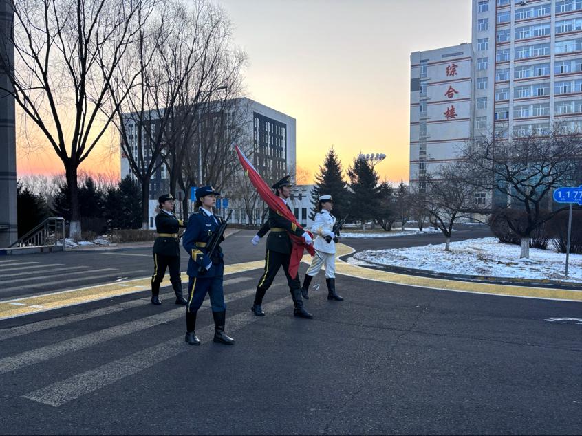 晨光熹微,寒意渐消。广场上,全体师生列队整齐、精神抖擞,静候仪式开启。伴随着庄严的《出旗曲》,牡丹江师范学院国旗护卫队队员身着笔挺的制服,迈着铿锵有力的步伐,昂首挺胸护送五星红旗走向升旗台,每一步都承载着对革命先烈的缅怀与对祖国的赤诚。当激昂的《义勇军进行曲》奏响,五星红旗冉冉升起、迎风飘扬,全体师生肃立注目,高唱国歌,目光中满是崇敬与坚定,现场氛围庄严肃穆,爱国之情在每个人心中激荡。