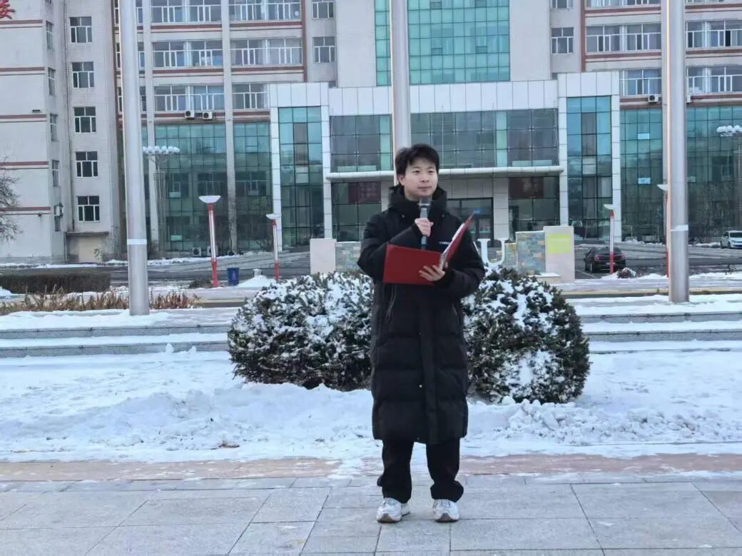 国歌奏唱完毕,学生代表张尧佳同学进行了以《以法为基,以志为翼:新时代青年的责任与远方》为主题的国旗下演讲。她围绕宪法精神的时代内涵,结合青年成长与国家发展的关系,阐释了宪法对公民行为的指引意义,并强调了新时代大学生践行宪法精神、勇担强国使命的重要性。演讲最后,她呼吁同学们将宪法意识融入日常生活,以理想为帆、以法治为基,在青春的赛道上奋力奔跑。