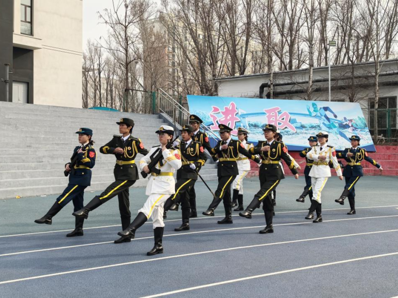 朝阳映衬下,校国旗护卫队步伐铿锵,护卫五星红旗庄严入场。在他们标准有力的动作引领下,全体师生庄严肃立,向国旗行注目礼。