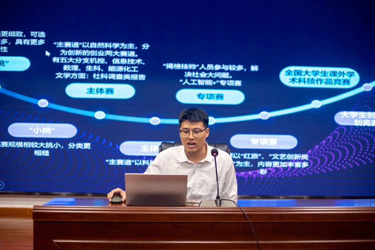 本次培训会上,三位往届获奖学生代表倾囊相授。“挑战杯”国赛铜奖得主刘岩,从选题策略切入,强调“问题导向”与“实践价值”的双重重要性,并分享了路演中如何通过精准表达与逻辑呈现打动评委;省赛金奖项目负责人朴浩男,揭秘团队协作“黄金法则”,提出“跨学科融合”是项目脱颖而出的关键,并结合案例解析如何打造核心竞争力;省赛银奖项目负责人蔡明亮,聚焦技术转化与实用性,呼吁参赛者“跳出理论舒适区”,通过校企合作与数据验证提升项目落地潜力。
