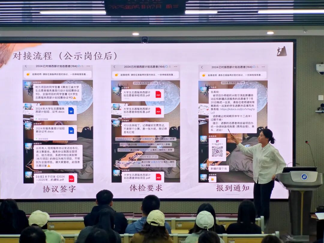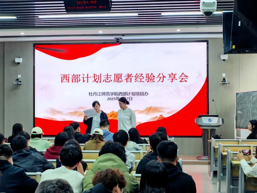 为深入学习贯彻习近平新时代中国特色社会主义思想和党的二十大精神,积极响应国家关于鼓励青年投身西部建设、服务基层的号召,贯彻落实共青团中央、教育部、财政部、人力资源社会保障部印发的《2025-2026年度大学生志愿服务西部计划实施方案》,扎实推进我校西部计划招募宣传工作,牡丹江师范学院西部计划项目办于5月7日下午在实训楼710会议室举办西部计划往届志愿者经验分享会,本次宣讲会邀请我校2024年西部计划志愿者服务于牡丹江市西安区司法局的刘美岐进行宣讲。
