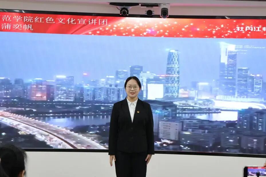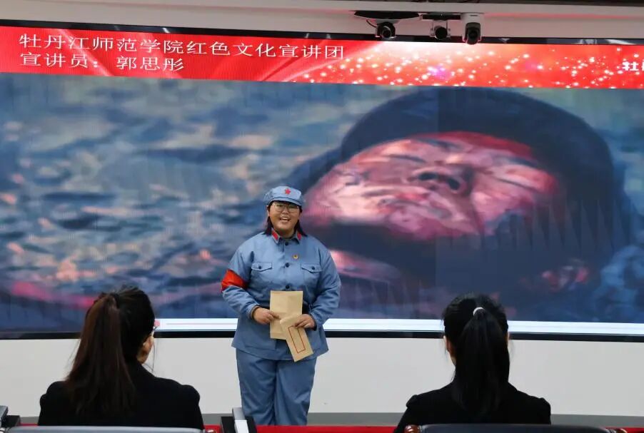 本次宣讲的同学分别为历史与文化学院的郭思彤、数学科学学院的陈宝润和蒲奕帆、计算机与信息技术学院的闫睿。他们用真挚的情感以及创新的表达,将红色故事转化为触动人心的精神力量。从八女投江的坚贞不屈,到少女嘎丽娅的英勇无畏;从钱三强戈壁滩的“蘑菇云”,再到革命烈士“甘将热血沃中华”的壮举。这些故事里有热血、有牺牲,更有中华民族不屈的脊梁。